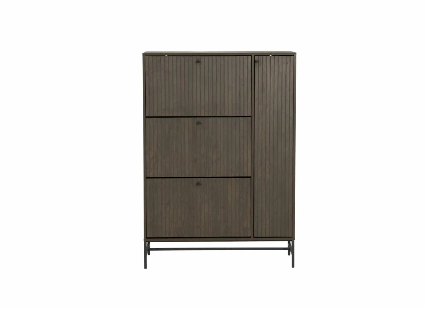 De kast staat op metalen poten in mat zwart, wat zorgt voor een luchtig Scandinavisch effect. Dankzij de royale afmetingen van 98,7 x 35 x 140,4 cm biedt de Stripes voldoende ruimte om meerdere paren schoenen netjes op te bergen, terwijl de verticale indeling zorgt voor een optimaal gebruik van de beschikbare ruimte.