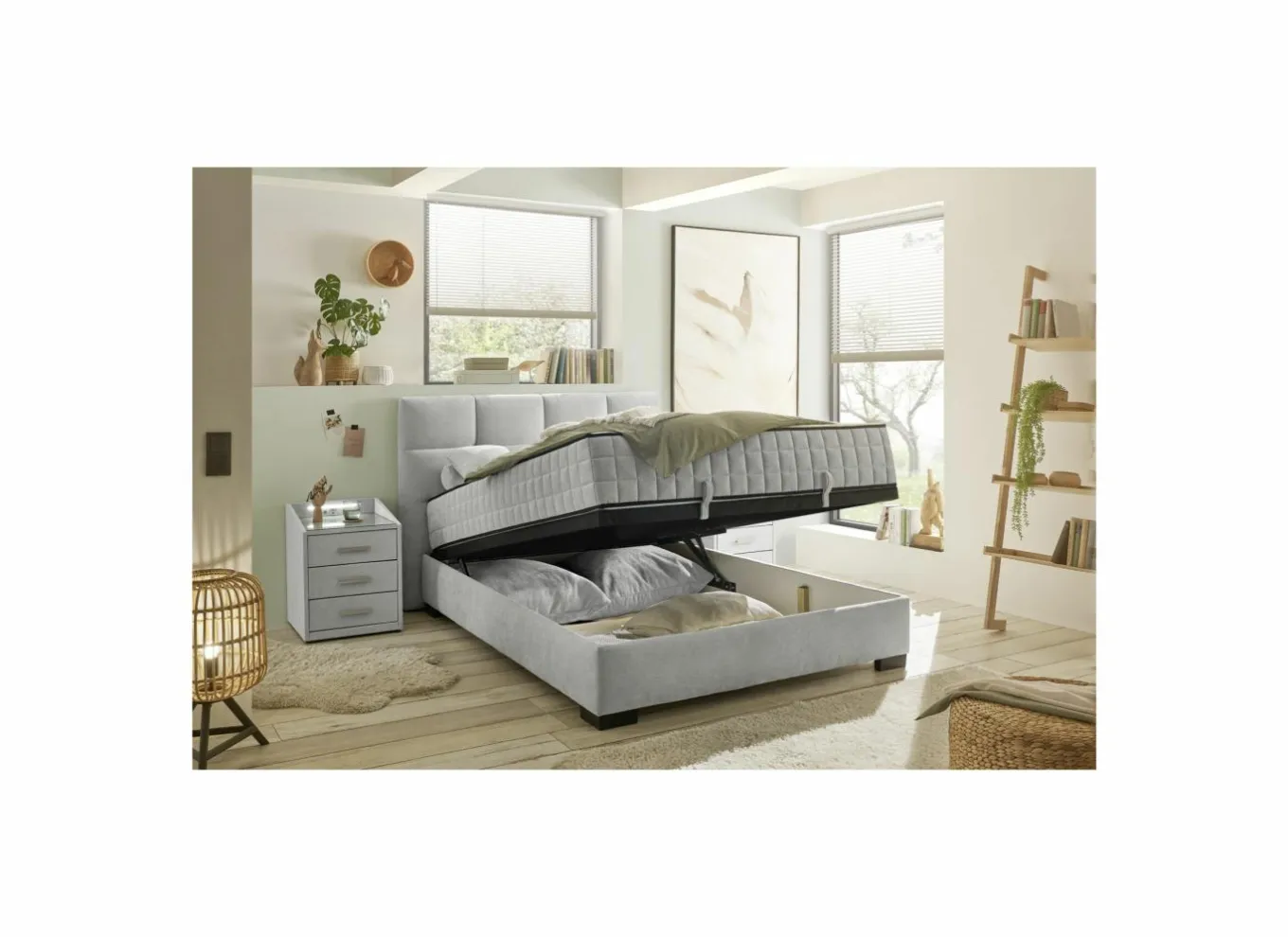 De bedbox heeft 1 opbergruimte, een hoofdbord van 114 cm en een lighoogte van 59 cm.