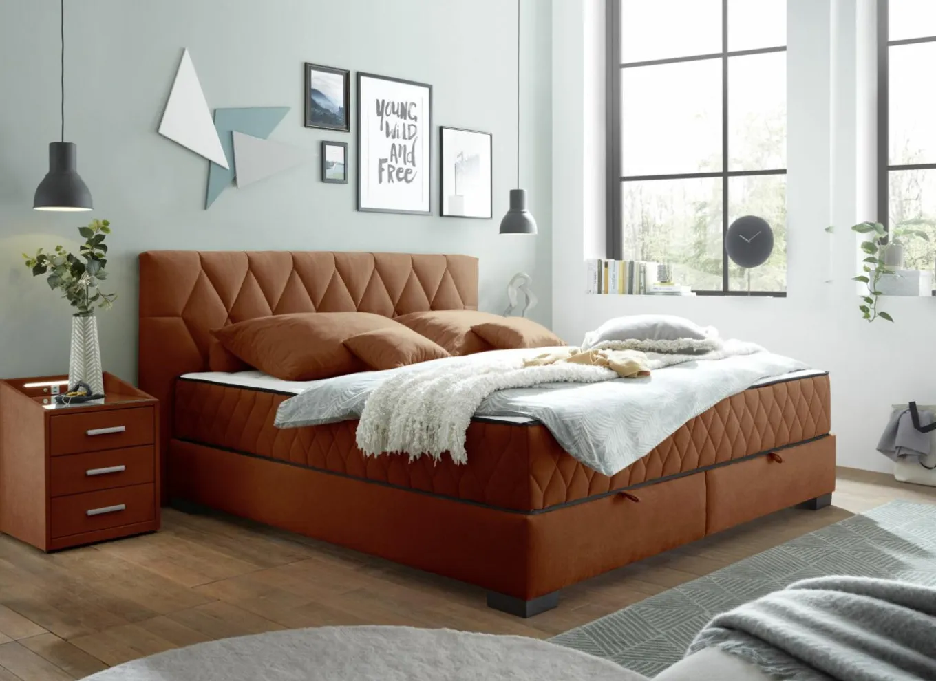 De bedbox heeft 2 opbergruimtes, een hoofdbord van 114 cm hoog in stof Wind (100% polyester) met diagonaal ruitvormig stiksel, en een lighoogte van 59 cm.