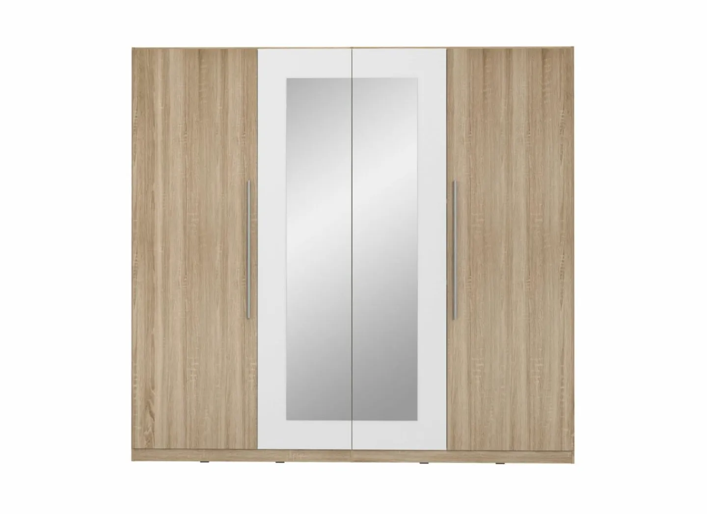 Deze 4-deurs kledingkast combineert een half hang- en half leggedeelte, waardoor u uw kleding overzichtelijk kunt opbergen. De twee centrale spiegeldeuren bieden extra gemak en laten de ruimte groter lijken. Dankzij de warme Sonoma eik afwerking met witte accenten straalt de kast moderniteit en elegantie uit. De constructie in stevige meubelplaat zorgt voor stabiliteit en langdurig gebruik, terwijl de ruime afmetingen voldoende opbergruimte bieden.